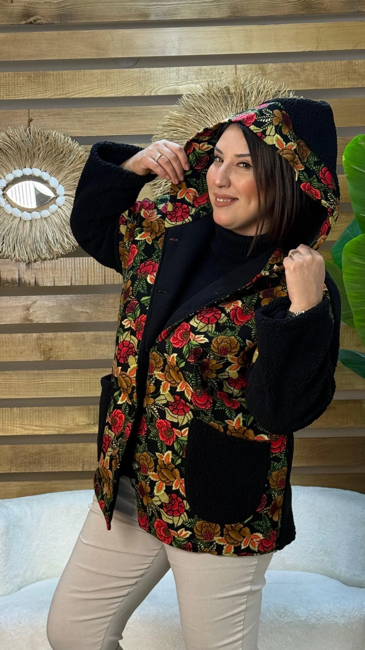 Tasarım Çiçek Motif Kapüşonlu Ceket